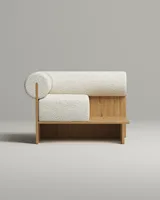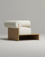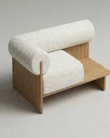 Компактное кресло которое работает как самостоятельный акцент в интерьере. Цилиндрическая спинка-валик поддерживает расслабленную посадку. Деревянная поверхность служит функциональной поверхностью для повседневных мелочей.