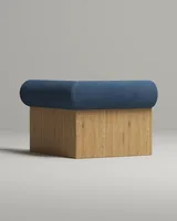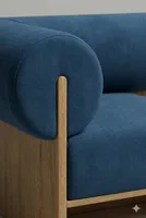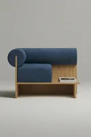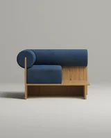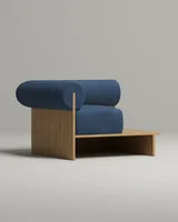 Компактное кресло которое работает как самостоятельный акцент в интерьере. Цилиндрическая спинка-валик поддерживает расслабленную посадку. Деревянная поверхность служит функциональной поверхностью для повседневных мелочей.