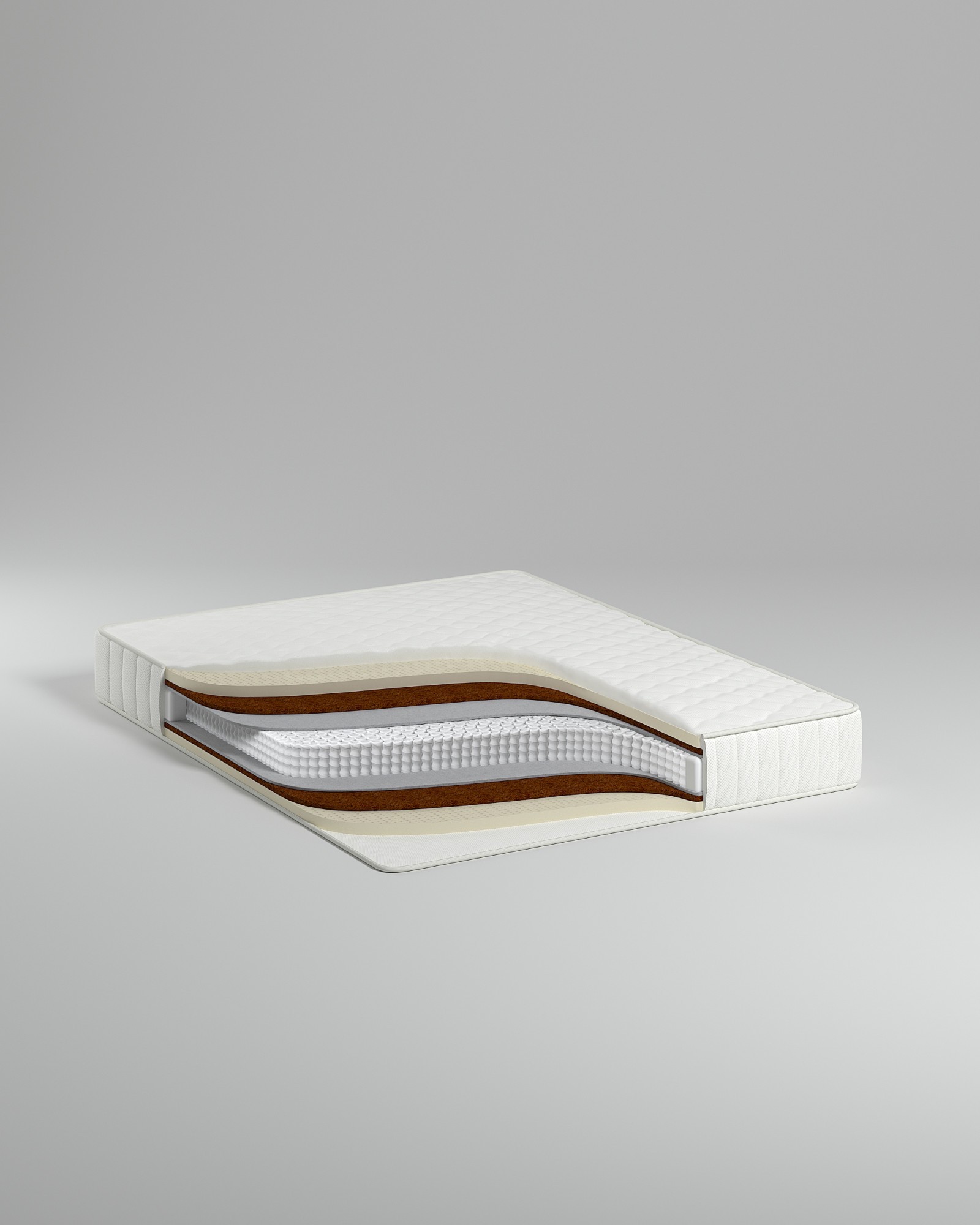 Кокосовая койра латексированная –1 см,жесткий наполнитель, пропитан латексом для устранения ломкости и увеличения срока эксплуатации. Независимый пружинный блок–14 см,пружины класса "стандарт" изготовлены из высокоуглеродной закаленной стали, толщина проволоки – 1,8 мм. Каждая помещена в отдельный прочный кармашек из спандбонда.